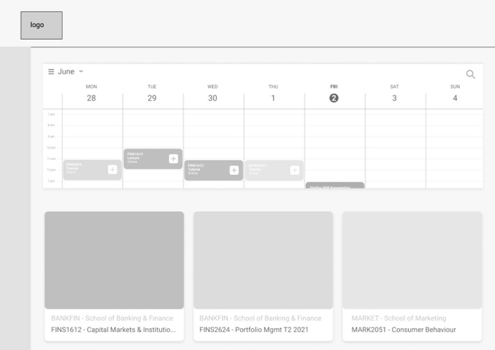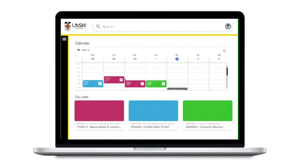 Our calendar will be synced to class timetables, which will predominately be from myUNSW, giving direct access to course pages and classes. Users can also link external calendars to the calendar timetable display, providing users the ability to also view their other commitments throughout the week, and plan out their days accordingly.