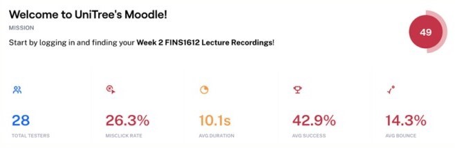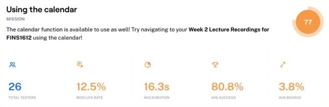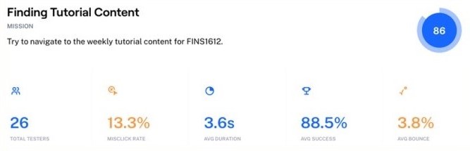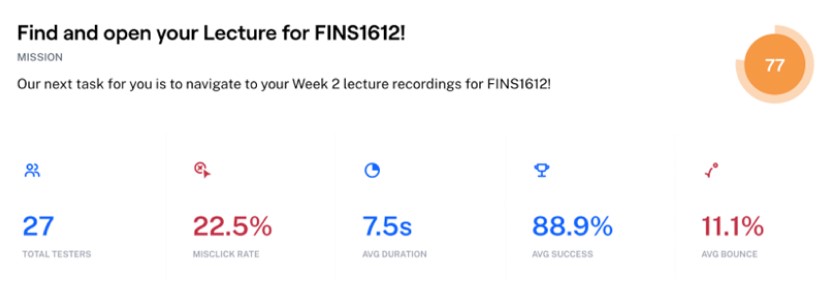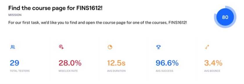 Volunteers were asked to complete a series of tasks and Maze would collect details such as mis-click rates, duration, average success rates, and percentage of users who gave up on a task. Test users included students, staff, and non-UNSW students who were unfamiliar with the original platform interface.